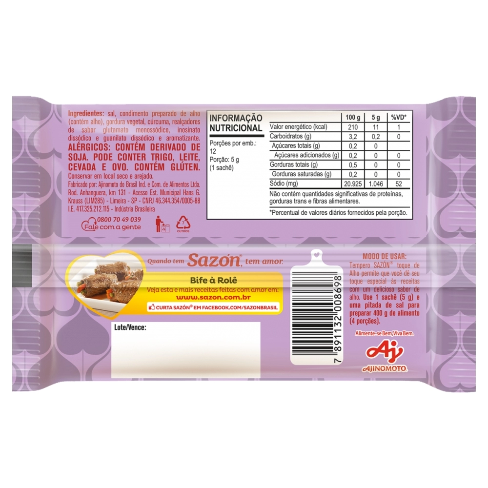 VAREJO>AJINOMOTO>SAZÓN>SAZON TOQUE ALHO 12X5G C/48
